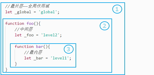 上图每一个蓝色方框代表一个作用域,进行变量查询时从当前作用域出发,如果找不到则往外一层,直至到达最外层(全局),最后依据是LHS还是RHS返回结果。