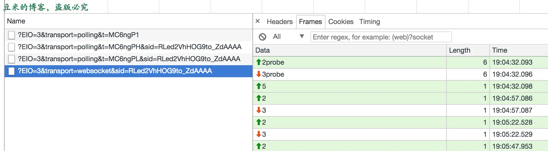 - transport=polling/websocket: 表示使用的长连接方式是轮询还是websocket