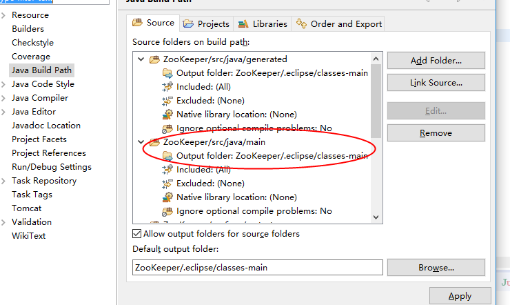 因此,必须将log4j.properties放到类路径下,那么对于可恶的ant工程,类路径在哪里呢?我也不清楚,于是我直接在eclipse右键工程Build Path->Configure build path找到类路径为%baseDir%\src\java\main,具体如下图: