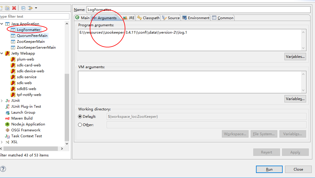 这里假设我的日志文件存放路径为E:\\resources\\zookeeper-3.4.11\\conf\\log\\version-2\\log.1,当我在eclipse中运行main方法时,设置传入的参数即可,如下图: