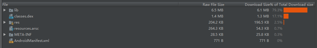 其中,在安装包中占比较大的包括:dex文件、res文件夹、assets文件夹、lib文件夹以及resource.arsc文件。所以,接下来的瘦身优化就是让这些文件变小,以此达到瘦身的目的。
