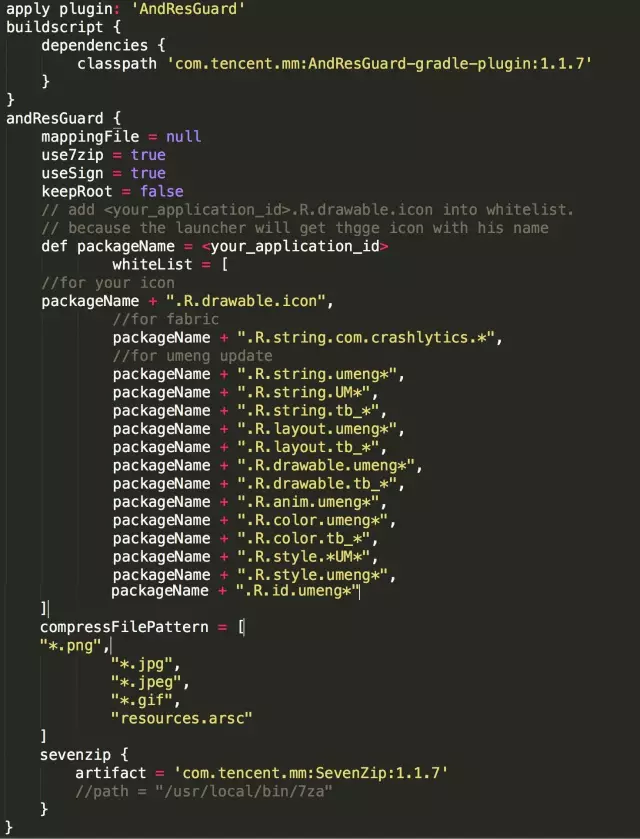 建议开启7zip,注意白名单的配置,否则会导致有些资源找不到,官方已经发布AndResGuard到gradle中了,非常方便: