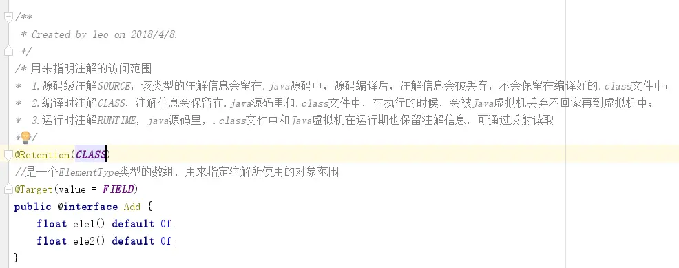 可以看到,因为是运行时注解,所以我们定义了@Retention是Runtime,定义了ele1,ele2两个看上去像函数的变量(在注解里这样写算是变量而不是方法或函数)