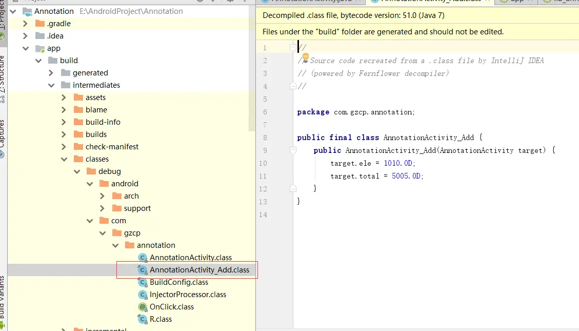看到了生成的AnnotationActivity_Add的文件,我们下面就去写一个注入方法,把我们想要结果拿出来展示: