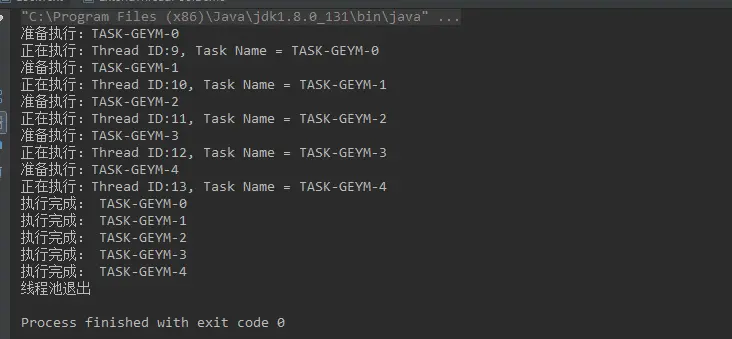 我们创建了一个线程池实例,并设置默认线程数量为5,并向线程池提交了10任务,分别打印当前毫秒时间和线程ID,从结果中,我们可以看到结果中有5个相同 id 的线程打印了毫秒时间。