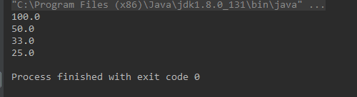 注意:只有4个结果,其中一个结果被吞没了,并且没有任何信息。为什么呢?如果仔细看代码,会发现,在进行 100 / 0 的时候肯定会报错的,但是却没有报错信息,令人头痛,为什么呢?实际上,如果你使用 execute 方法则会打印错误信息,当你使用 submit 方法却没有调用它的get 方法,异常将会被吞没,因为,如果发生了异常,异常是作为返回值返回的。