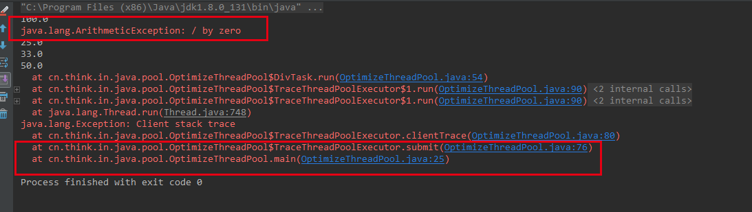 从结果中,我们清楚的看到了错误信息的原因:by zero!并且堆栈信息明确,方便排错。优化了默认线程池的策略。