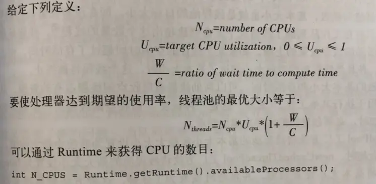 线程池的大小对系统的性能有一定的影响,过大或者过小的线程数量都无法发挥最优的系统性能,但是线程池大小的确定也不需要做的非常精确。因为只要避免极大和极小两种情况,线程池的大小对性能的影响都不会影响太大,一般来说,确定线程池的大小需要考虑CPU数量,内存大小等因素,在《Java Concurrency in Practice》 书中给出了一个估算线程池大小的经验公式: