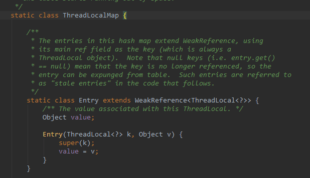 就是这个map,这个map 持有一个 Entry 数组,Entry 继承了 WeakReference ,也就是弱引用,如果一个对象具有弱引用,在GC线程扫描内存区域的过程中,不管当前内存空间足够与否,都会回收内存。这个特性我们之后再说。