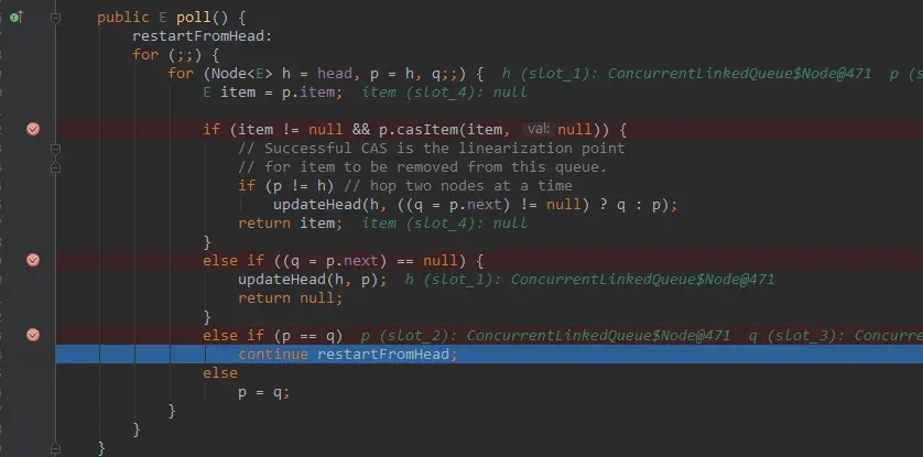 // 如果 p == q,说明别的线程取出了 head,并将 head 更新了。就需要重新开始