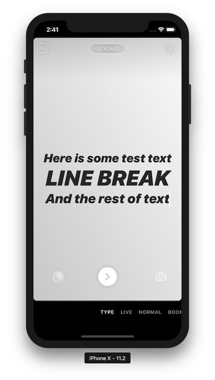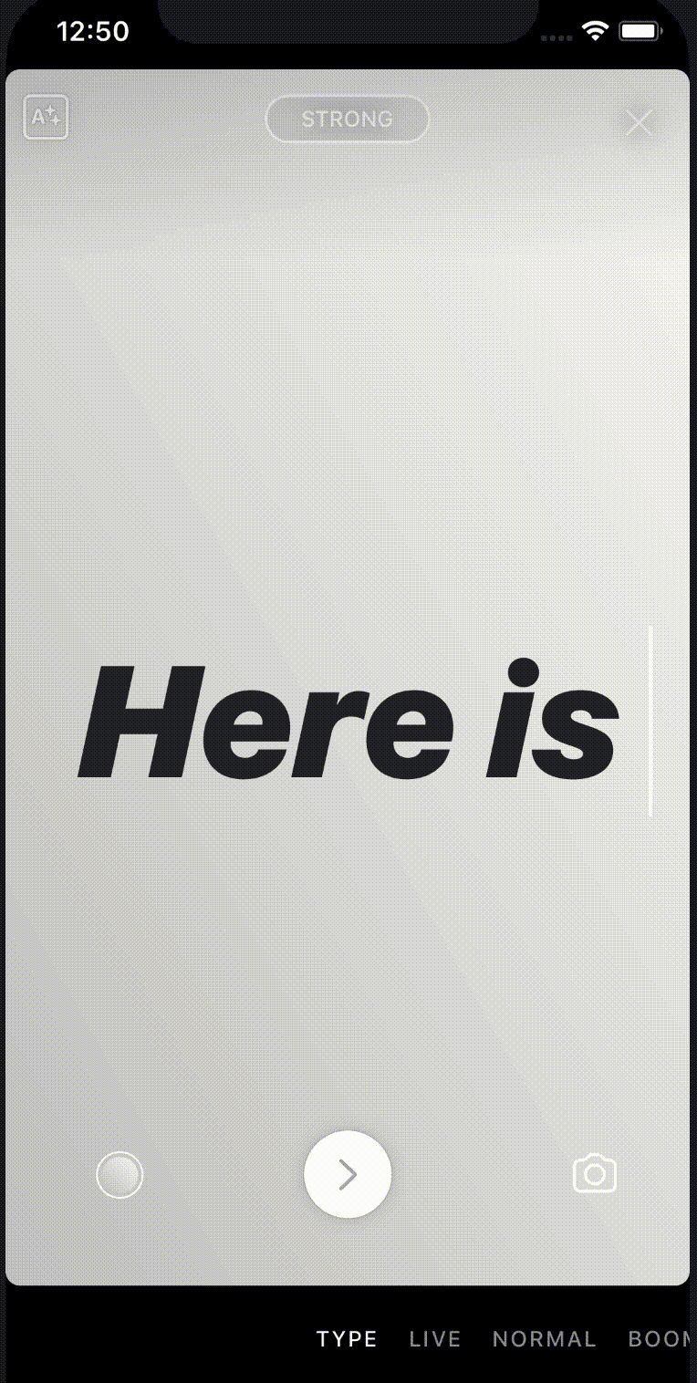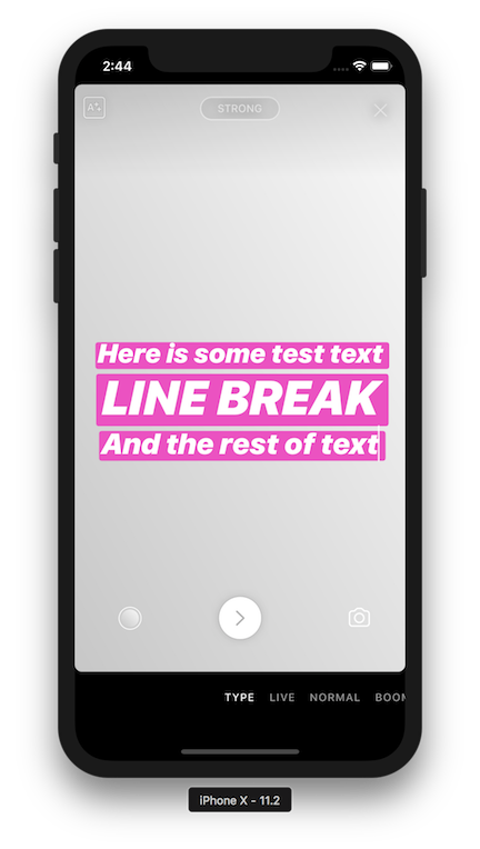 在 Type Mode 下,我们想要创建一个让人们可以强调特定的单词或短语的文本输入体验。一种方法是构建两端对齐的文本样式,动态调整每一行的大小,以填充既定的宽度(在 Instagram 的现代、霓虹和粗体中使用)。