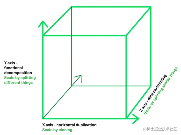 用《The art of scalability》一书里提到的scale cube比较容易理解如何拆分。你看,我们叫分库分表,别人总结成了scale cube,这就是抽象的能力啊,把复杂的东西用最简单的概念解释和总结。X轴代表运行多个负载均衡器之后运行的实例,Y轴代表将应用进一步分解为微服务 (分库),数据量大时,还可以用Z轴将服务按数据分区(分表)