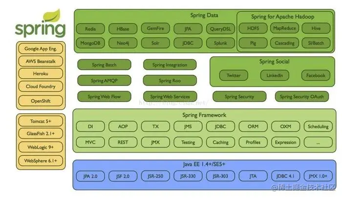 Spring Framework:即通常所说的spring 框架,是一个开源的Java/Java EE全功能栈应用程序框架,其它spring项目如spring boot也依赖于此框架。