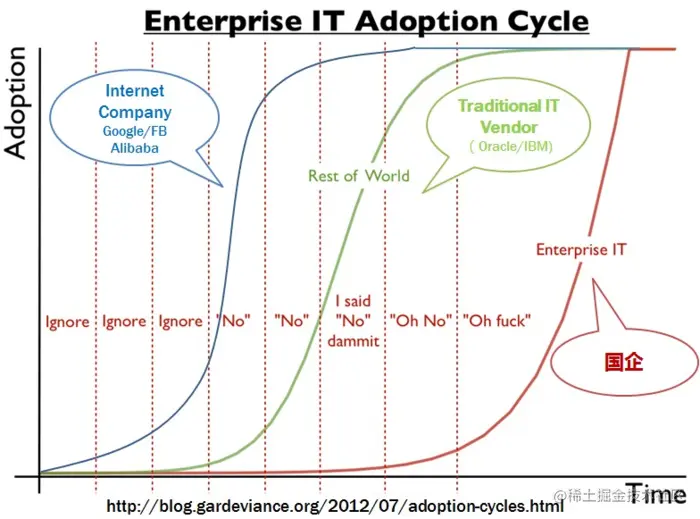 其实本来所谓的微服务就是对互联网在应用技术的一个总结归纳,IT厂商鼓吹所有概念无非是为了生意(business),SOA是,Cloud是,Microservice也是。下面玩笑很有意思的概括了这个情况(我加了第一条线,原图见这里)
