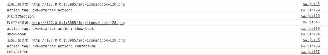 e.action获取的值,就是我们在showNotification()中定义的actions里的action。因此,通过e.action就可以知道用户点击了哪一个操作选项。注意,当用户点击提醒本身时,也会触发notificationclick,但是不包含任何action值,所以在代码中将其置于default默认操作中。