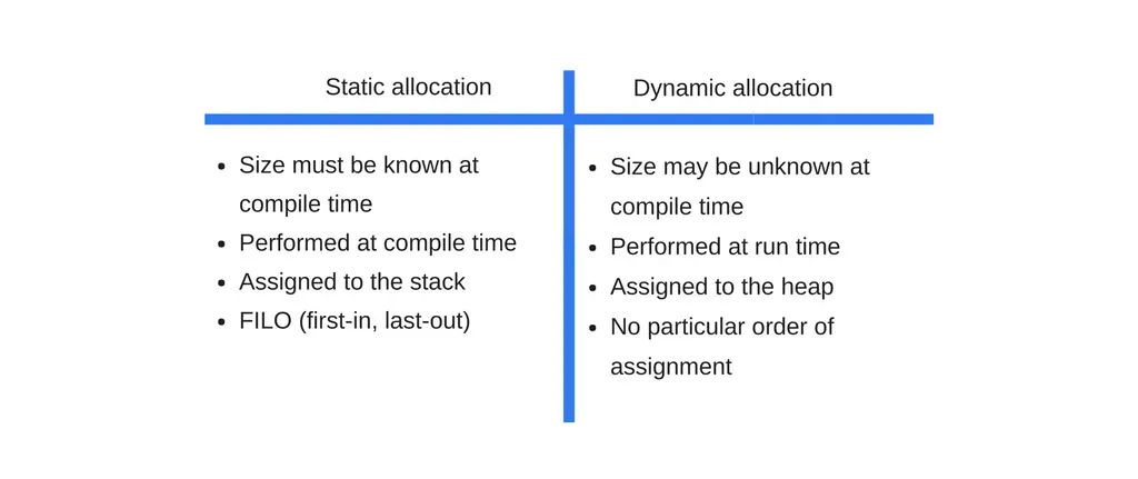 因此,就不能够在堆栈中为变量分配内存空间。相反,程序需要在运行时显式地从操作系统分配到正确的内存空间。这里的内存是由动态内存空间所分配的。静态和动态内存分配的差异总结如下图表: