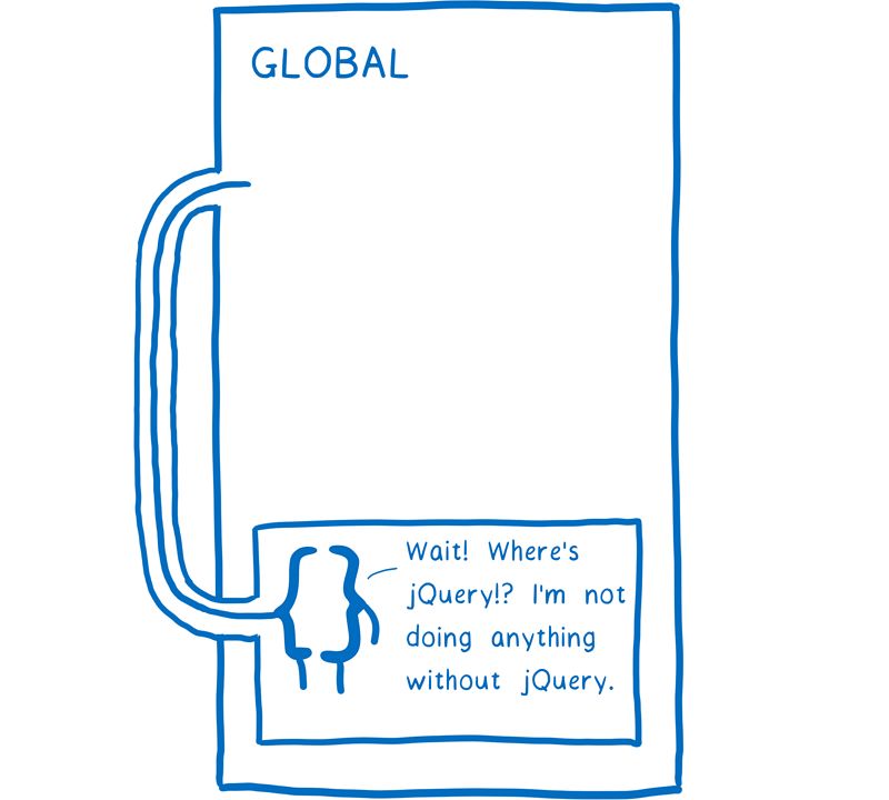 在 jQuery 时代这种提升做法相当普遍。在我们加载任何 jQuery 插件之前,我们必须确保 jQuery 已经存在于全局作用域。