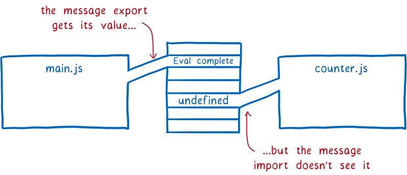 如果导出值采用的是实时绑定方式,那么 counter 模块最终会得到真实的 message 值。当超时定时器开始计时时,main.js 的运行就已经完成并设置了 message 值。