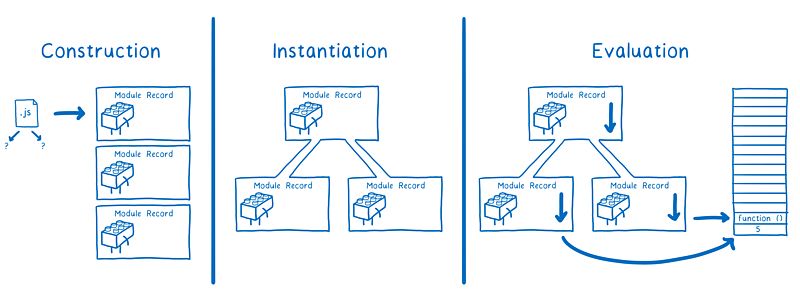 不过,这三个阶段本身是没必要异步化。它们可以同步执行,这取决于它是由谁来加载的。因为 ESM 标准并没有明确规范所有相关内容。实际上,这些工作分为两部分,并且分别是由不同的标准所规范的。