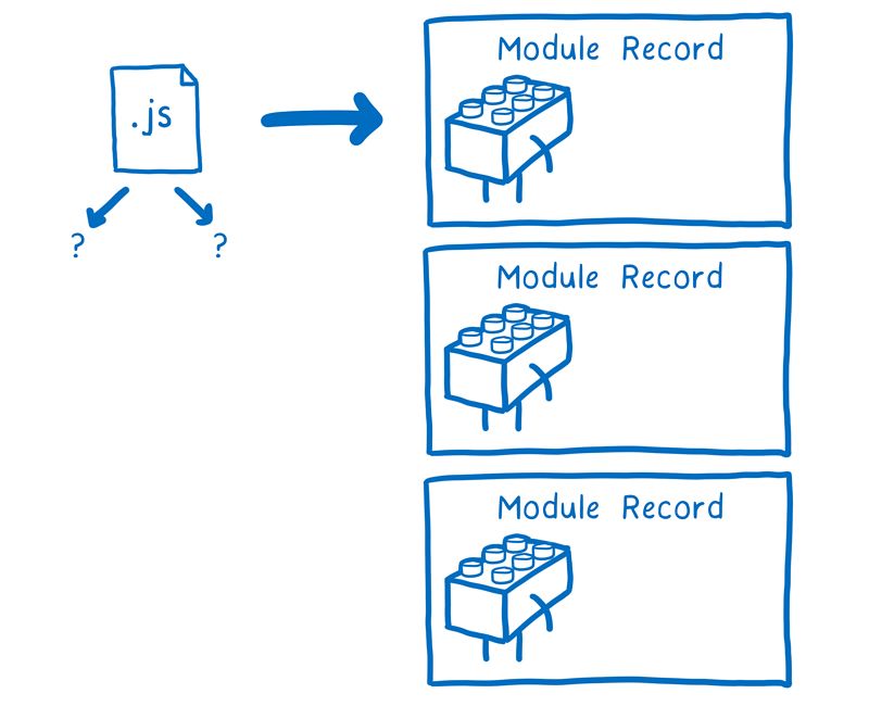 但是呢,浏览器并不能直接使用这些代码文件。它需要解析所有的文件,并把它们变成一种称为模块记录(Module Record)的数据结构。只有这样,它才知道代码文件中到底发生了什么。