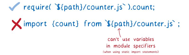 其中一个就是,在 Node 的 CJS 中,你可以在模块定位符中使用变量。因为已经执行了 require 之前的代码,所以模块定位符中的变量此刻是有值的,这样就可以进行模块定位的处理了。