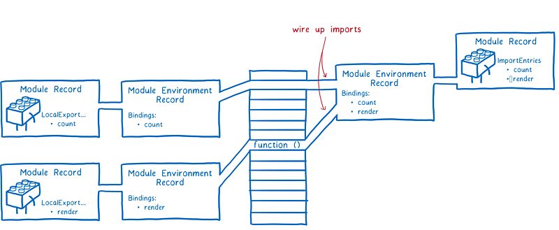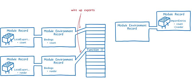首先,JS 引擎会创建一个模块环境记录(Module Environment Record)。它管理着模块记录的所有变量。然后,引擎会找出多有导出在内存中的地址。模块环境记录会跟踪每个导出对应于哪个内存地址。