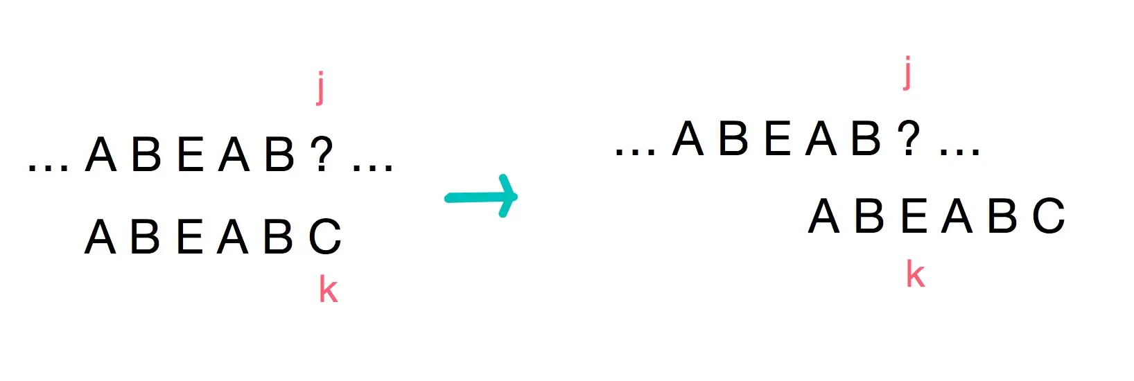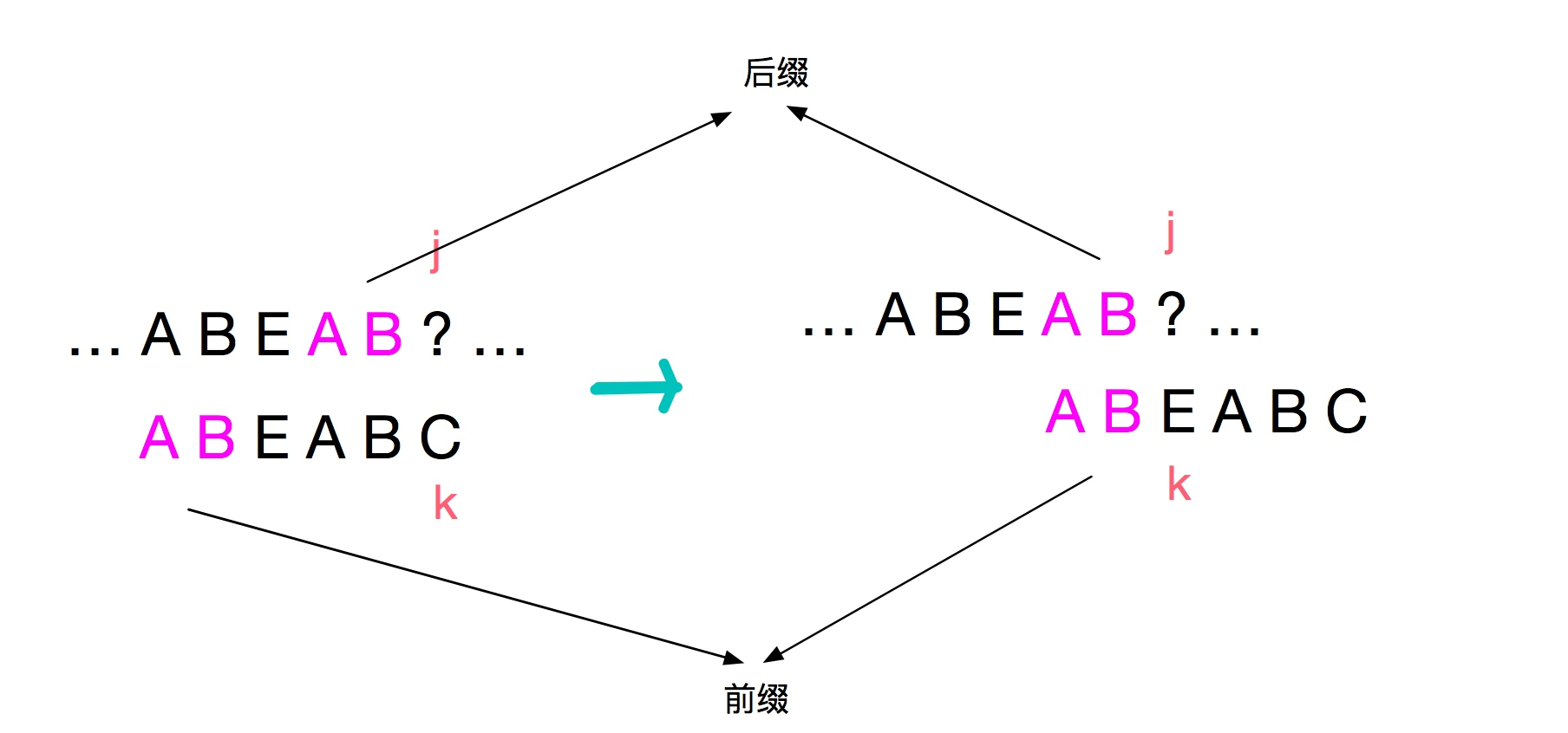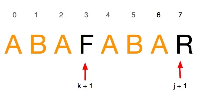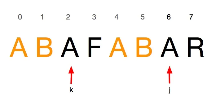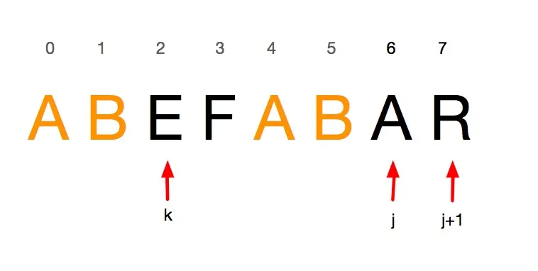 可以看出在寻找字符串ABEFABA的最大前后缀交集时,k与j发生了失配