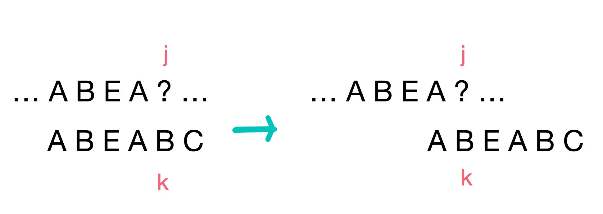 补充一下,为什么搜索词在移动到 K = E的位置停了下来? 这里可以感性的理解,由于在移动过程中 AB成功进行了匹配,而在不知道 ‘?’所代表的具体字符是多少的情况下继续向前移动搜索词,则可能会出现错失匹配的情况。