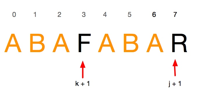 k'的含义从公式中看的很清楚(前缀与后缀的交集的最大值)。而另一层含义则是,如果搜索词下标从0开始计算,当k处失配时,我们只需要将k移动到k'处继续匹配即可。