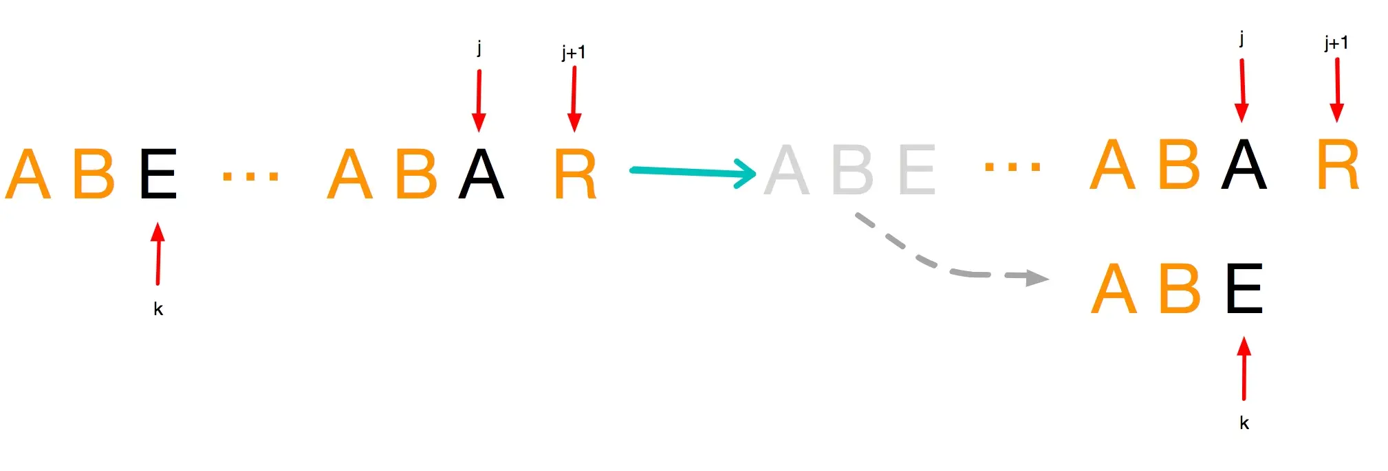 gif中模拟了指针k在字符c处失配的情况,通过这样一个预处理,在实际匹配中,如果遇到了这种情况,我们只需要从容的将搜索词指针移动到E处,然后继续匹配即可。