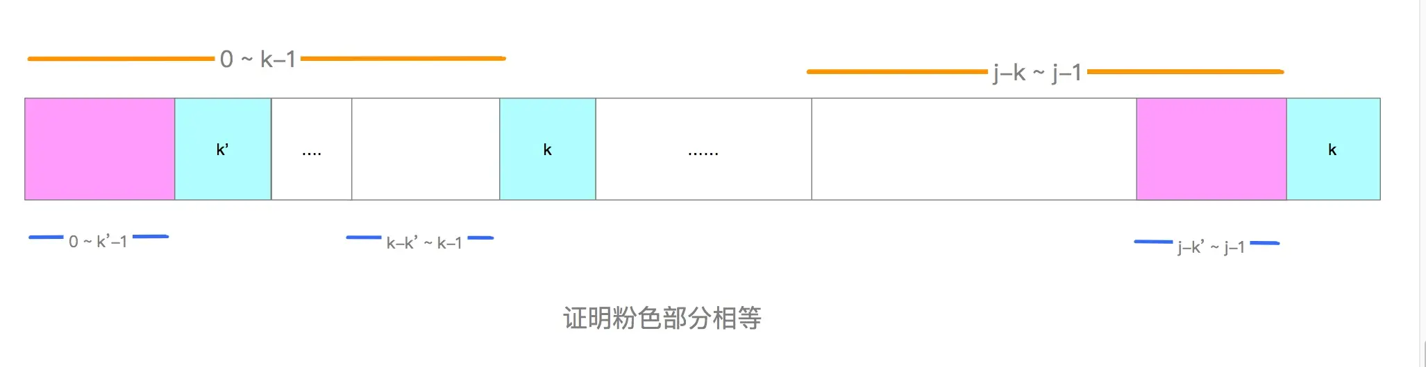 w[k] != w[j],所以另k' = next[k],假如此时w[k'] == w[j],如何证明w[0 ~ k'] == w[j-k' ~ j]呢?(图中粉色部分) 由k' = next[k]得到w[0 ~ k'-1] == w[k-k' ~ k-1]由