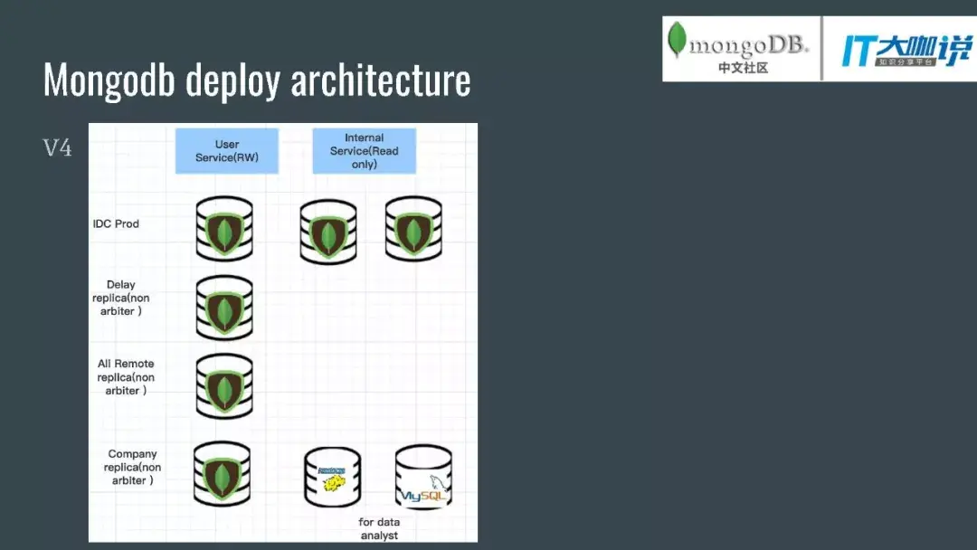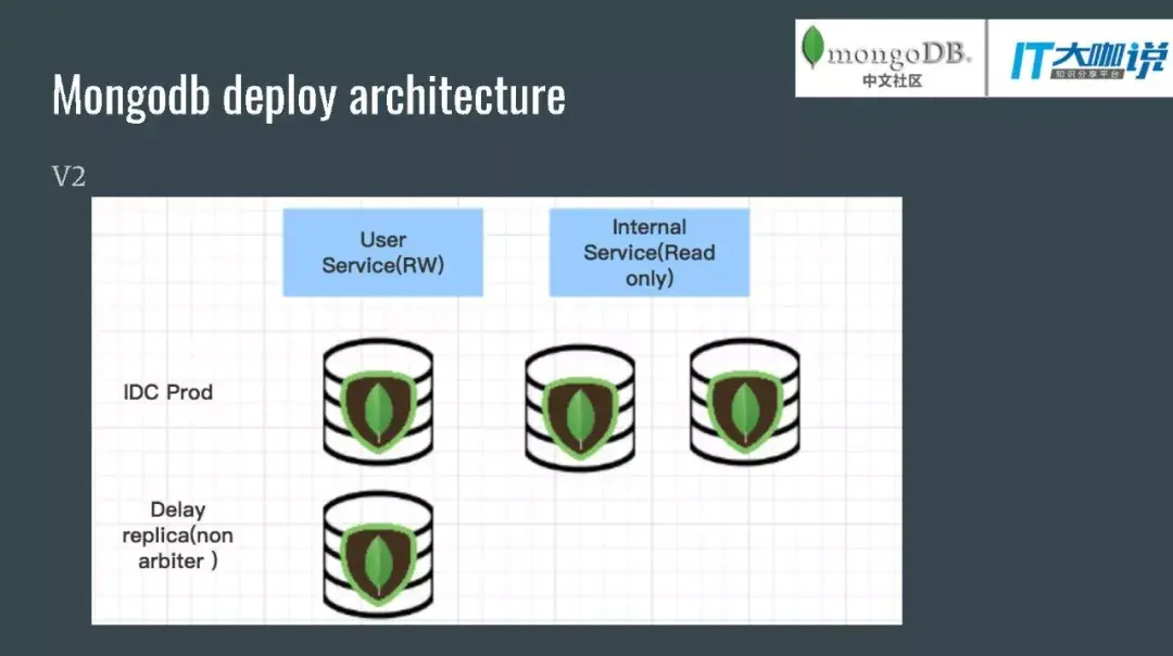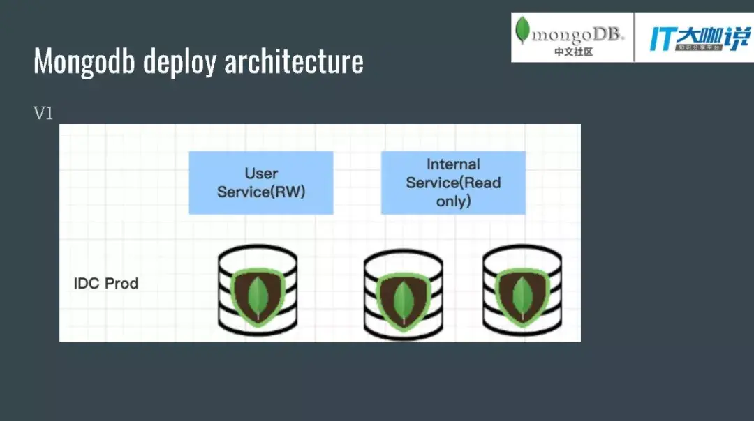 我们最初版本的Mongodb部署很简单,三个节点在IDC机房部署一个读写分离的架构。