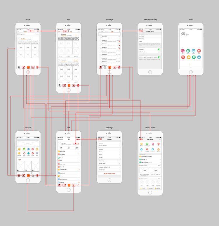 这个原型的主要页面有:主页、热门页面、消息页面、个人信息页面、设置页面等。