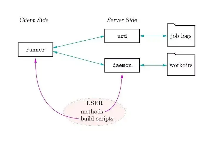 是一个基于客户端 / 服务器的应用程序。在左侧有一个 runner 客户端,在右边有两台服务器,称为 daemon 和 urd,其中 urd 是可选的。runner 通过执行脚本(构建脚本)在 daemon 服务器上启动作业。此服务器将加载和存储使用基于 workdirs 文件系统的数据库执行的所有作业的信息和结果。同时,构建脚本中所有有关作业的信息将由 urd 服务器存储到作业日志文件系统的数据库中。 urd 负责管理作业,包括存储和检索之前执行过的相关作业的会话或清单。