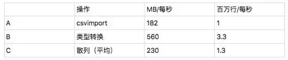 上述数值是基于全部数据得出的。导入作业(A):导入 gz 压缩文件。有趣的是,导入比普通的 zcat file.gz> /dev/null 要快 30%。在 FreeBSD 上,zcat 速度更快。类型转换作业(B):5 个 json-list、5 个数字、2 个日期和 2 个 unicode 列,每行平均有 172 个字节。该作业的读取速度超过每秒半千兆字节,同时保存几乎相同数量的数据到磁盘上,因此磁盘带宽高于每秒 1 千兆字节。由于散列速度取决于被散列的列,因此显示的值(C)是四个散列作业的平均值。