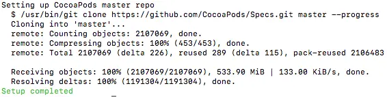 接下来执行命令,$ pod setup 设置cocoapods, 出现Setting up CocoaPods master repo 说明cocoapods正在下载东西,耐心等待就好了,喝喝茶,撩撩妹~~~~~~~~~~~~~~~~~~~~~emmmmm, 大概过个半个小时到1个小时就OK了。