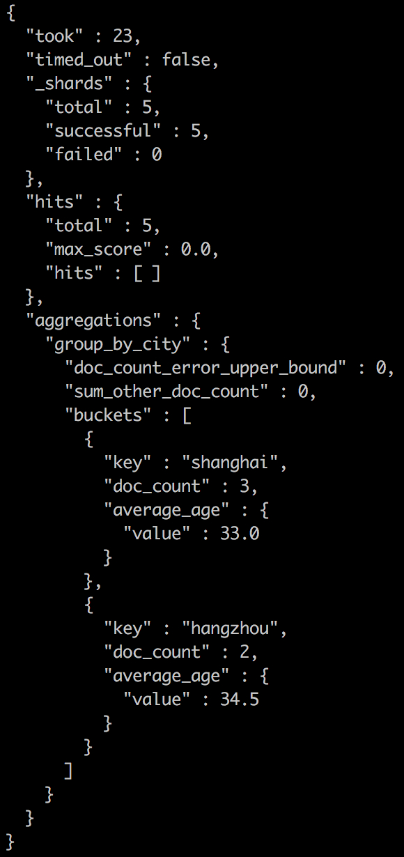 由于size设置为0,它并没有返回文档的信息,只是返回了聚合的结果。