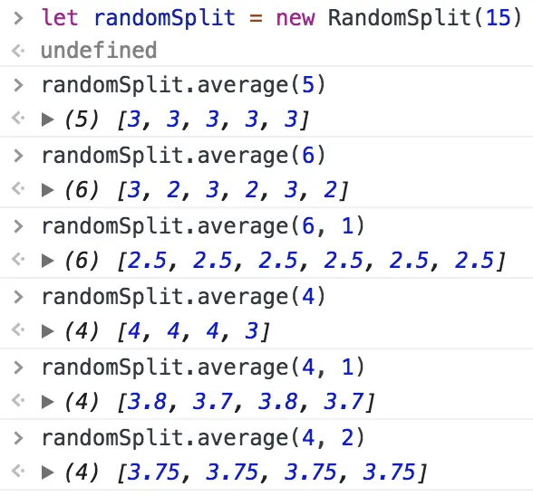 看“环形”二字,仿佛需要使用双向循环链表,为节省代码,这里只用一维数组模拟其效果,在数组首尾做数据衔接即可。在该算法中,所有用于分配交换的数字的原子单位都是整数1,所以均分也需要均分为整数,例如总数15均分为6份,先每份分到2(Math.floor(15/6)===2),还余3(15%6===3),为了使后面用于计算的概率尽可能平均,我们需要把这余下的3个单位均匀洒落到那6份里面,类似过程如下图: