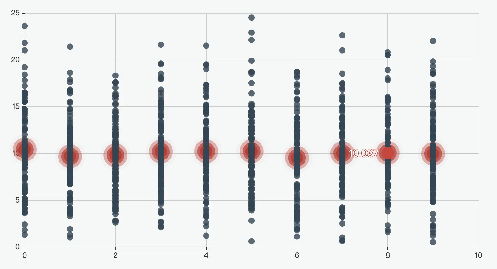 使用Echarts绘制随机分配结果,将100数额划分为10份,精度为1,横坐标为顺序位置,纵坐标为分配到的数额: