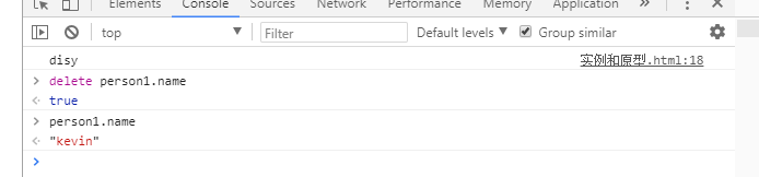 可以看出。删除实例中的name后,向上查找到了原型中的name属性。