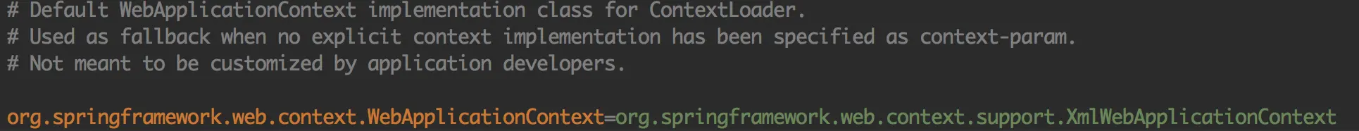 }determineContextClass,字面意思为检测Context的class类型,会读取servletContext的初始化参数contextClass,大部分情况下我们不会配置此参数,在未配置的情况下,Spring会去org.springframework.web.context包中的ContextLoader.properties配置文件读取默认配置: