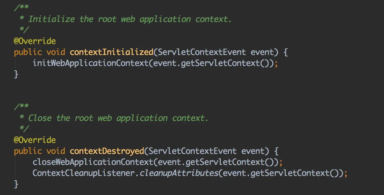 public class ContextLoaderListener extends ContextLoader implements ServletContextListenerContextLoaderListener继承了ContextLoader,并实现了ServletContextListener接口,在web容器初始化的时候,会触发ServletContextListener接口中的contextInitialized()方法,同理,在容器关闭的时候,会触发对应的contextDestroyed()方法。