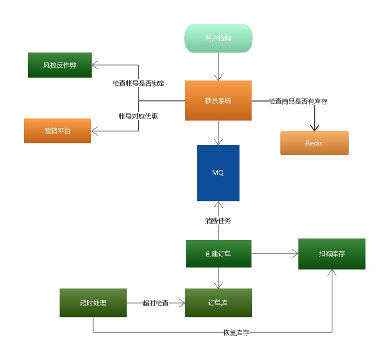 秒杀其实可以当做高并发系统来处理,在这个时候,可以考虑从业务上做兼容,将同步的业务,设计成异步处理的任务,提高网站的整体可用性。