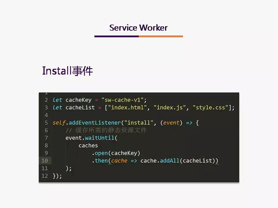 一旦判断出用户需要安装离线包,它就会通过注册的过程把worker脚本注册成当前页面的Service Worker。而这个worker就会把配置里的资源列表下发到worker脚本里面。Worker就会走一遍流程把这些资源加载并缓存在本地。