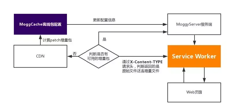 因为md5已经更新了,所以worker脚本就会重新发送请求到我们的服务。这时如果服务发现资源有可用的增量包,就会把这个增量包直接返回给Service Worker。Service Worker通过判断请求头就可以执行不同的策略。