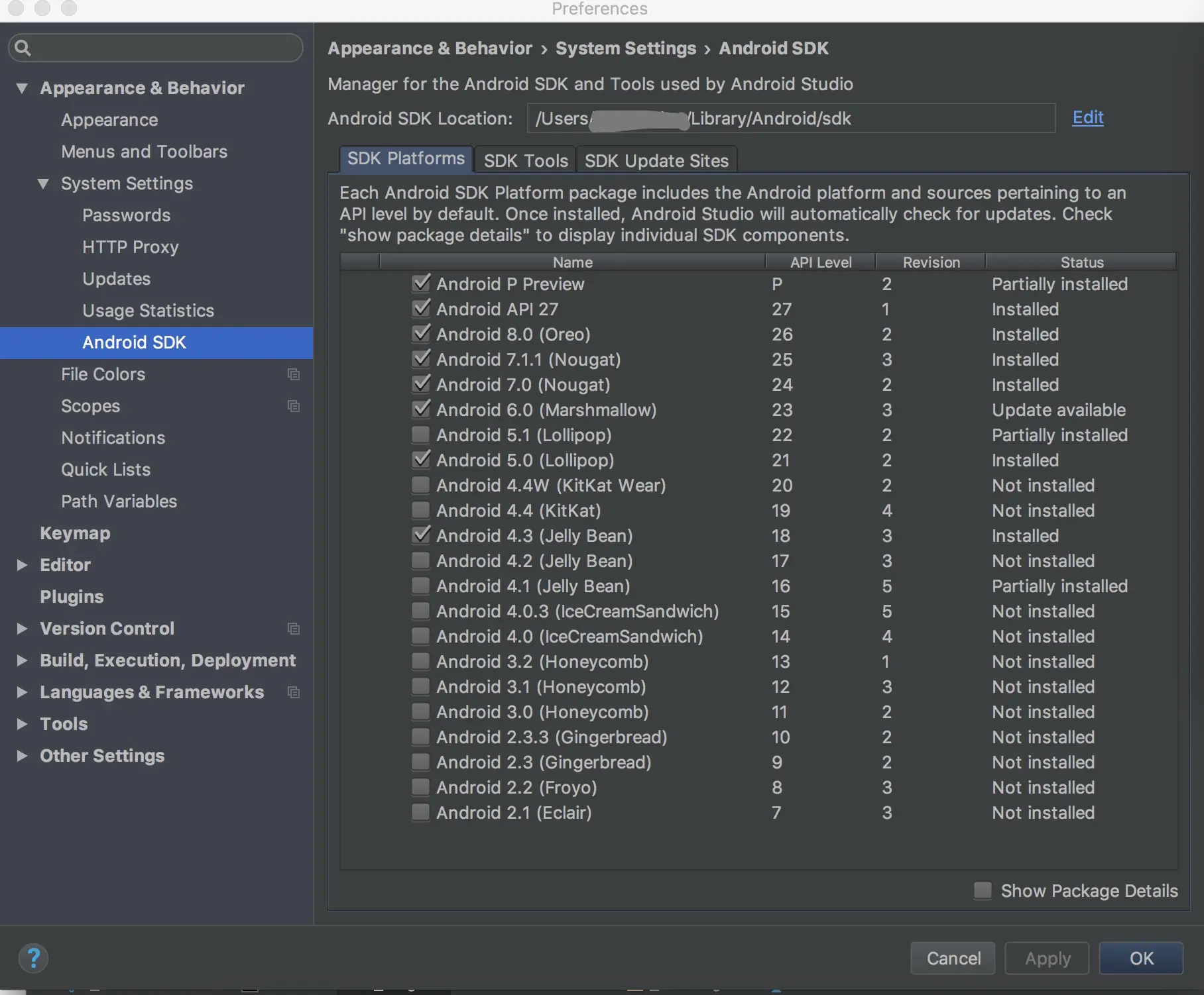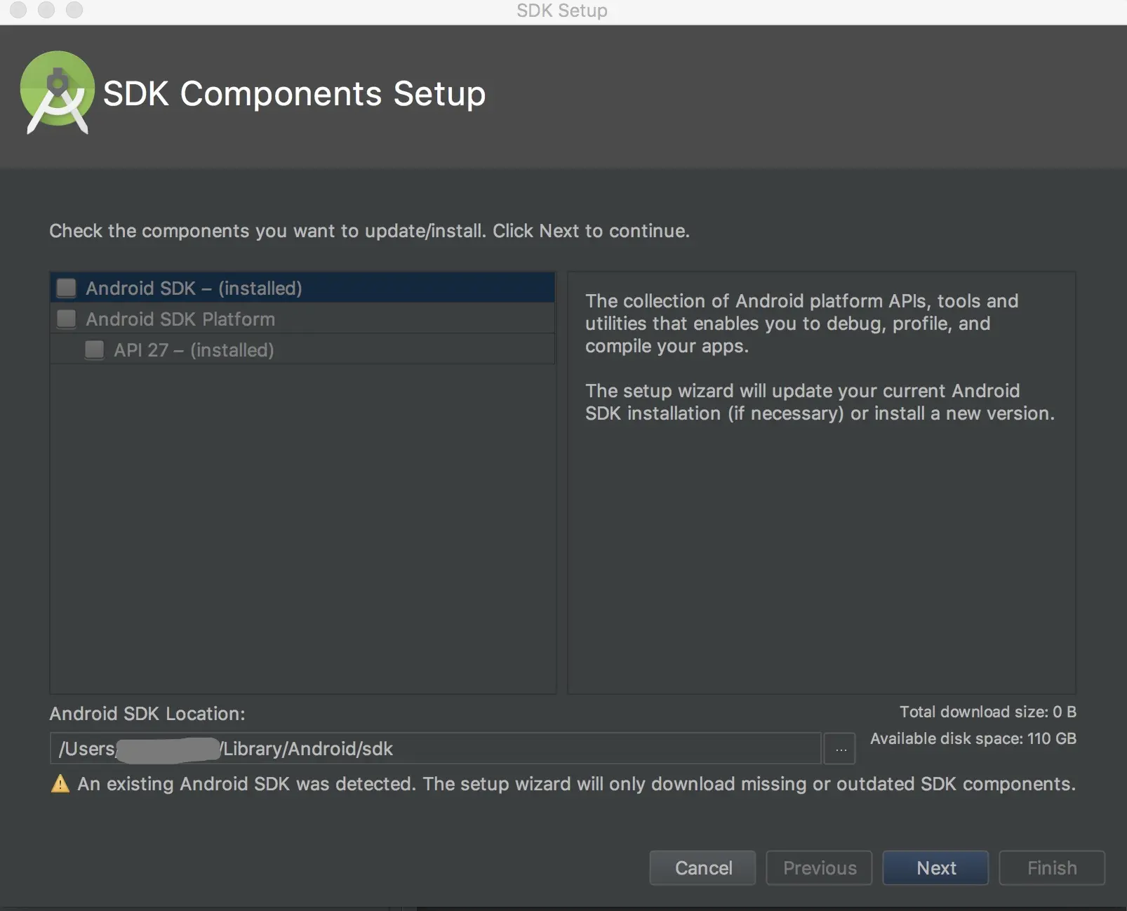 单击“Edit”链接之后打开SDK的设置界面如下图所示,这里SDK的目录保持不动,单击页面下方的“Next”按钮,在下一个页面继续单击“Next”按钮,等待Android Studio下载最新的编译工具,我这边是下载了最新的27.0.2版的build-tools。下载完成后单击页面右下角的“Finish”按钮完成更新操作。