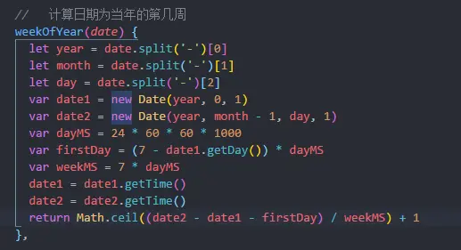 weekOfYear(date) { let year = date.split('-')[0] let month = date.split('-')[1] let day = date.split('-')[2] var date1 = new Date(year, 0, 1) var date2 = new Date(year, month - 1, day, 1) var dayMS = 24 * 60 * 60 * 1000 var firstDay = (7 - date1.getDay()) * dayMS var weekMS = 7 * dayMS date1 = date1.getTime() date2 = date2.getTime() return Math.ceil((date2 - date1 - firstDay) / weekMS) + 1 },