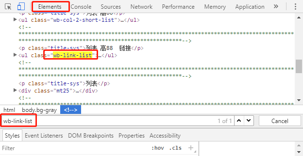 在控制台的Elements面板下,按Ctrl+F,可以在当前页面搜索特定的代码。