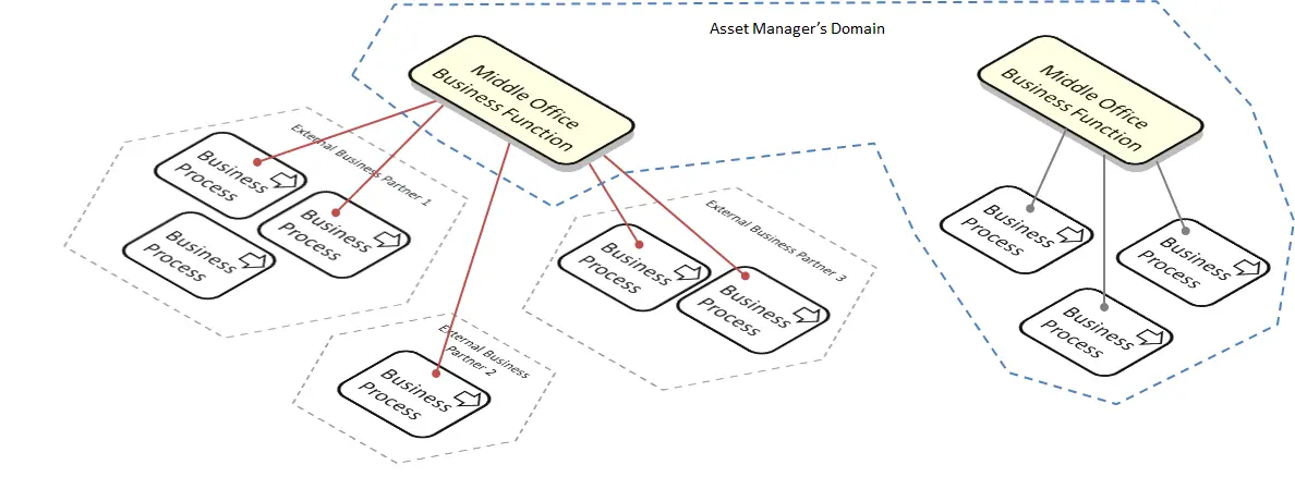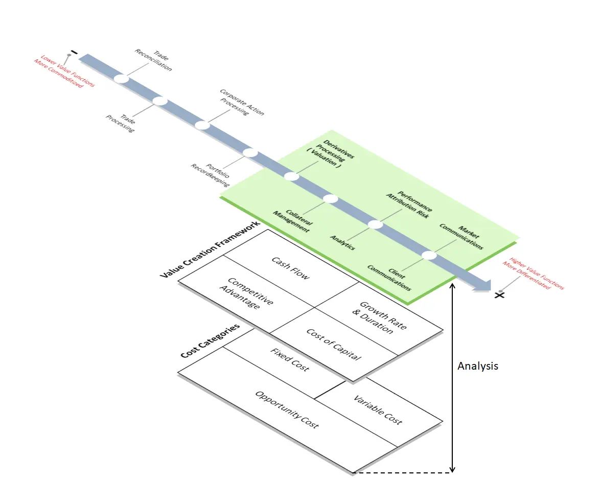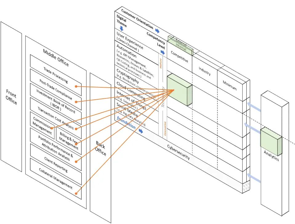 在目前的模式下,中台部门的功能仍然主要在内部进行。然而,随着数字化转型框架相关的数字主题的出现,金融服务机构,特别是投资管理机构有机会将这种业务能力转化为可能产生收入的竞争力来源。正如2016年4月28日“金融时报”报道的那样,为了实现这一转变,资产管理公司必须超越传统的一维降本计划(劳动力削减计划),该文章标题为“瑞银将改革财富管理业务以削减成本”。中台部门的职责需要发送转变,这是很有必要的。