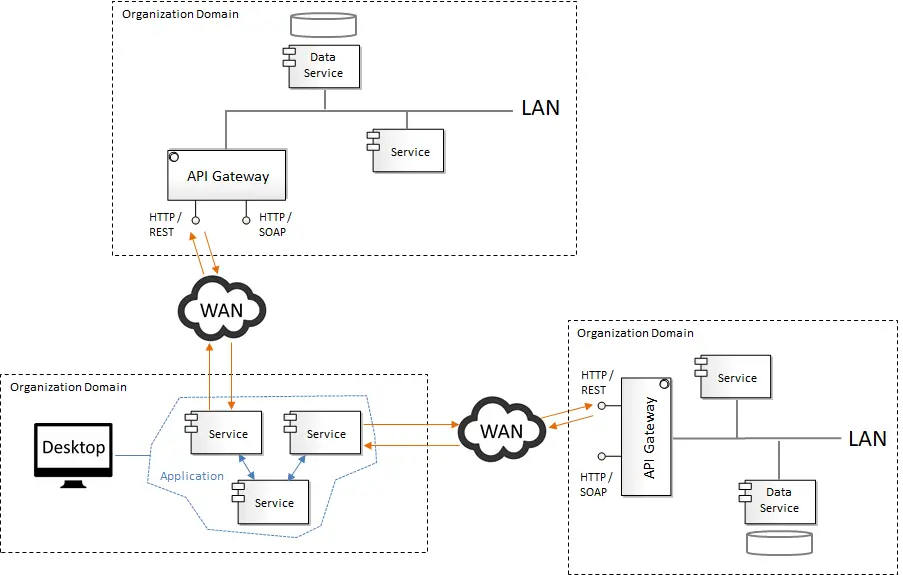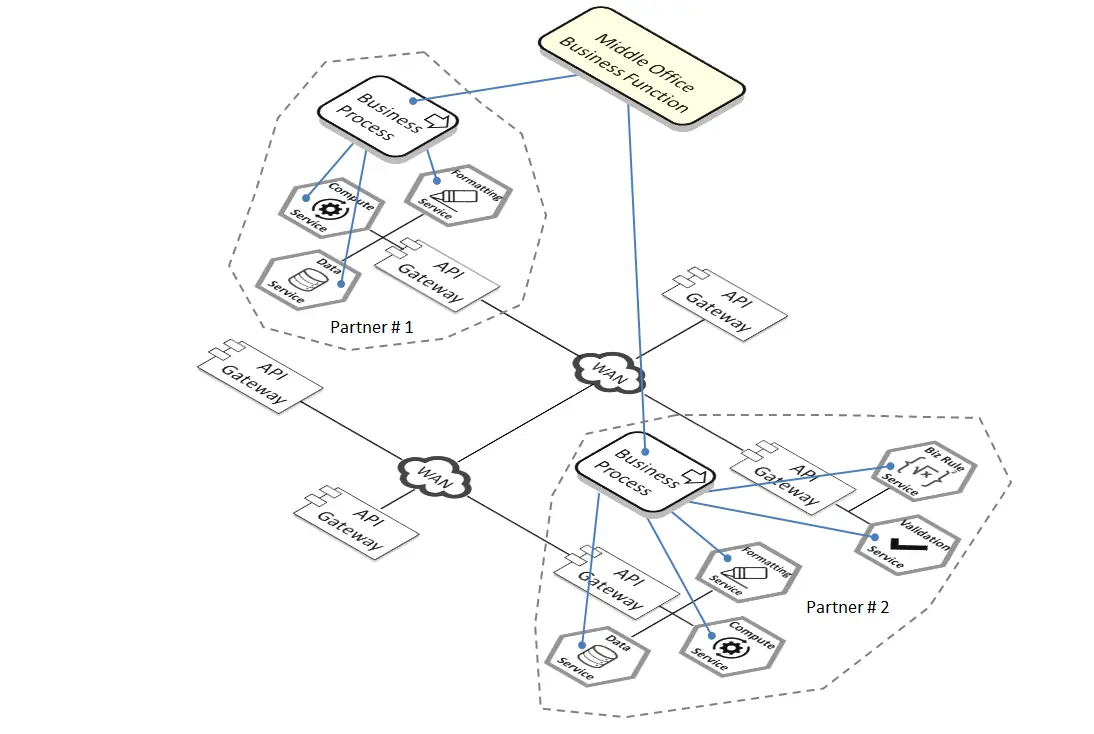 图32显示了如何利用多个API网关来促进架构“可组合”企业。它是一种架构,致力于分解可重用模块中的业务和技术元素,它们可以进行组合或重新组合,以前所未有的速度和灵活性抓住业务机会,同时只给公司的业务运营带来最小程度的可控中断。